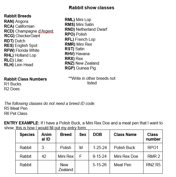 5. All exhibitors must be members in good standing of a 4-H/FFA Rabbit project to be shown and entries must be submitted by registration deadline. No entries will be accepted after this date.
